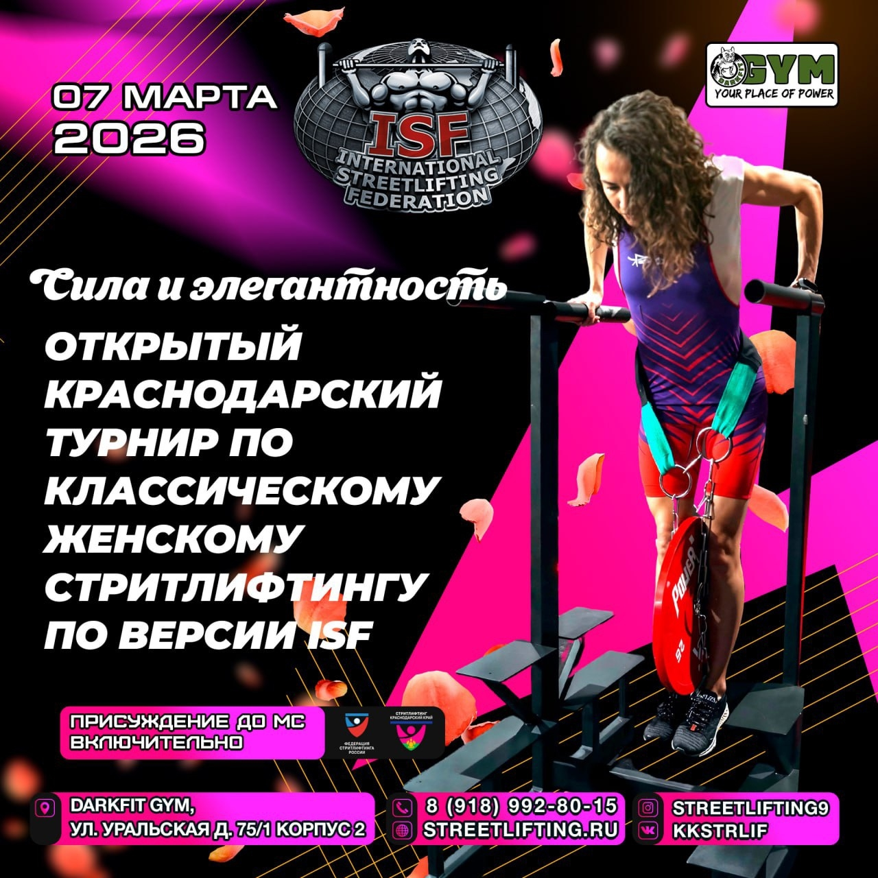 07 марта 2026 года в городе Краснодар состоится Открытый Краснодарский турнир по классическому женскому стритлифтингу ISF «Сила и Элегантность», приуроченный к празднованию Международного женского дня.